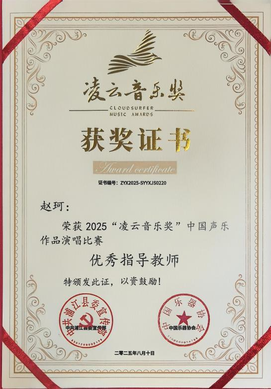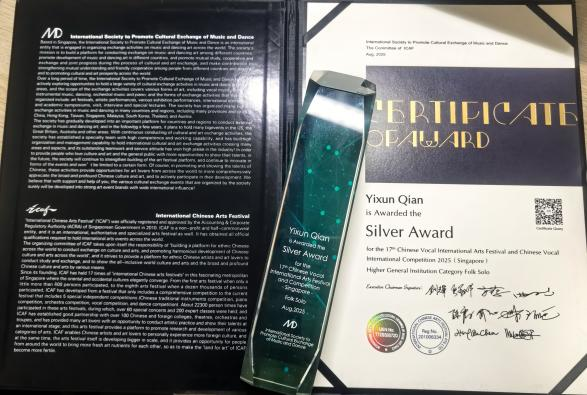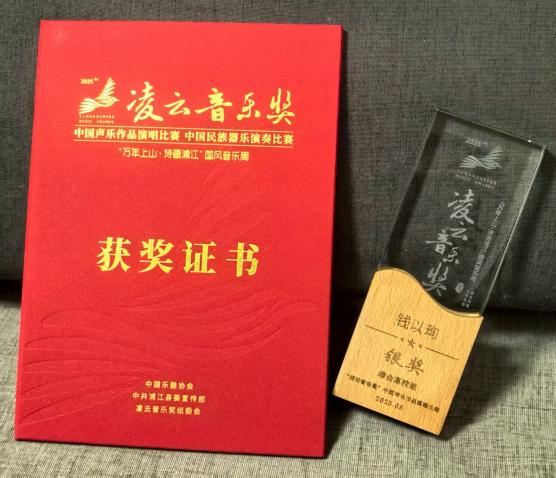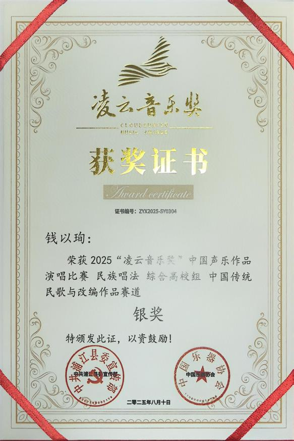 在2025“凌云音乐奖”中国声乐作品演唱比赛中,钱以珣获专业组民族唱法综合高校组传统民歌与改编作品赛道银奖(第三名)。该赛事旨在推动中华优秀传统文化创造性转化与创新性发展,弘扬中国声乐艺术精神,为青年声乐人才提供选拔与展示平台。