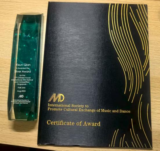 在第十七届中国声乐国际艺术节暨中国声乐大赛(新加坡)中,钱以珣获专业民族唱法高等院校组银奖。此项赛事依托“国际华人艺术节”,致力于为中国声乐艺术家与爱好者搭建国际交流平台,推动中国声乐艺术的国际化发展。