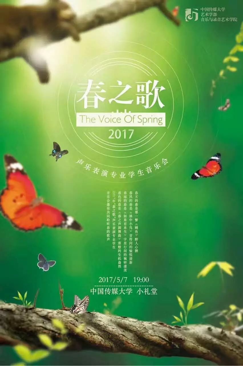 At 17:00 on May 7, 2017 at 19:00, a small auditorium at Communication University of China will welcome a refreshing audio-visual feast. The 2017 Spring Song vocal performance student music sponsored by the School of Music and Recording Arts of the School of Arts of our University,